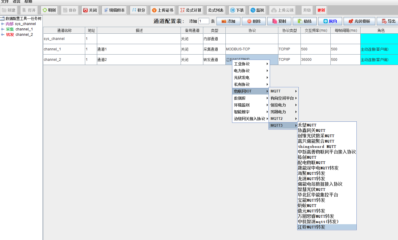 新建一个转发通道,协议选择江铃MQTT,主参数中,IP地址与端口号,填写实际的MQTT服务器的IP地址与端口号;交互频率即为实时数据全量上传的时间间隔,设置范围为1s < time < 12hour,建议设置为5分钟;
