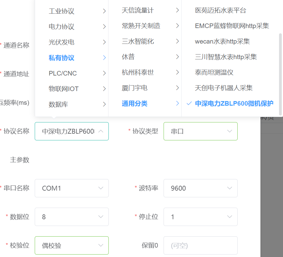 新建一个采集通道,协议选择中深电力ZBLP600微机保护,主参数中,串口名称按照网关实际的接线情况选择对应的COM口(COM1对应A1、B1,以此类推),波特率9600bps,8位数据位,1位停止位,偶校验位,其它参数如无特殊要求保持默认即可;