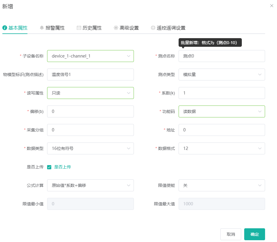 进入创建的设备中,添加测点,按照协议中的循呼数据报文(图中灰色部分)中的数据顺序位置,填写寄存器地址、是否按位取值和取值起始终止位,数据类型选择16位有符号,读写属性选择只读。
