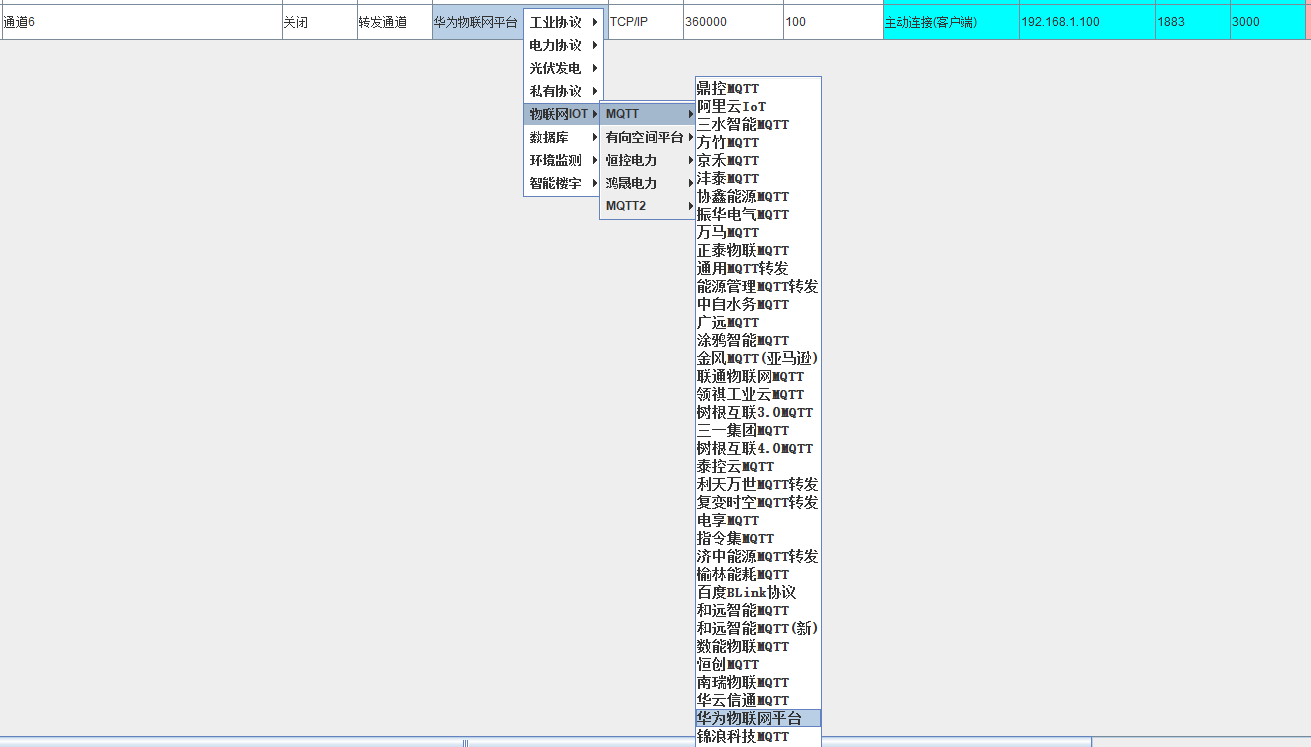 新建一个转发通道,协议选择华为物联网平台,主参数中,IP地址与端口号,填写实际的MQTT服务器的IP地址与端口号;