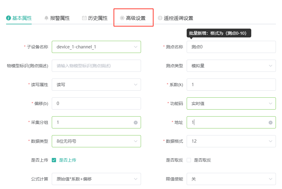 2.对于报文中一个字节数据对应多种不同情况的设置:报文中一个字节的数据可能对应多种情况(例:byte1有0x00,0x03,0x04,0x05这四种情况),此时则需要增加四个测点来处理这四种情况。此时这四个测点的地址都为1(根据测点的地址配置要求byte1对应的地址是1)。同时选择高级设置,将数值转换打勾。原始值中填入该测点对应的情况,转换后的值全为1,然后确定即可;