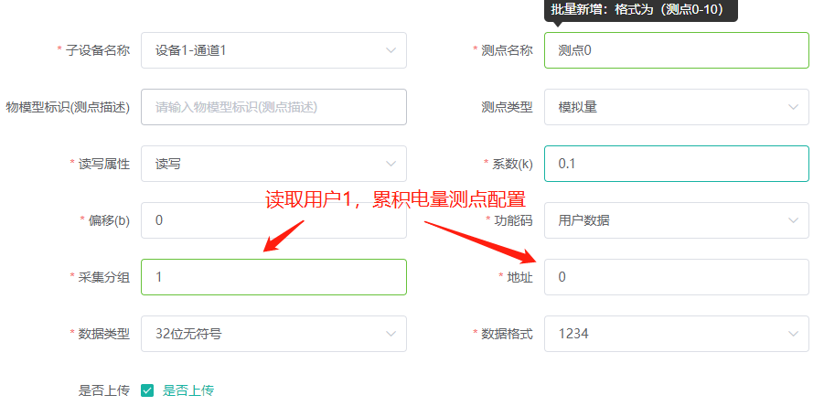 测点分组的百位和千位指定数据类型,数据类型合理取值范围是1-10(含),个位和十位必须为0;
