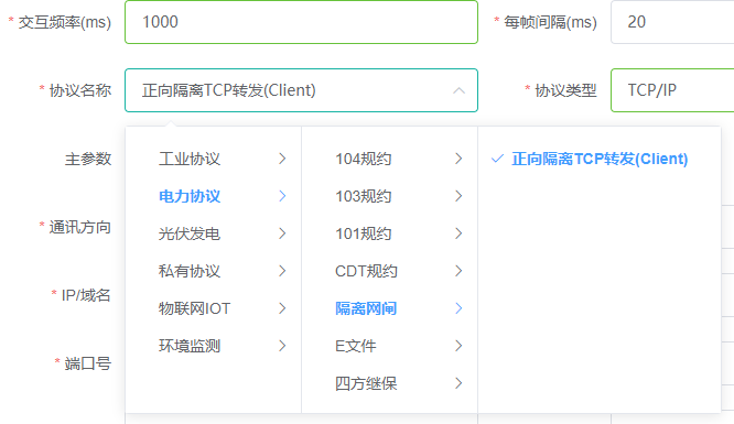 新建一个转发通道,协议选择正向隔离TCP转发(Client),交互频率即为数据上传的时间间隔,建议设置为1000ms,可以适当放大、缩小,然后填写ip地址和端口号(以实际情况为准);