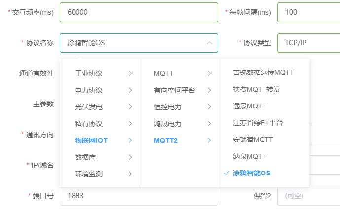 新建一个转发通道,协议选择涂鸦智能OS,主参数中,IP/域名和端口号均保持默认即可;