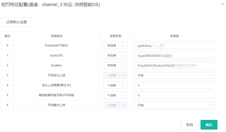 产品ID、UUID、tuyaKey等参数请在规约特征中设定,该三个参数为网关本身的参数。