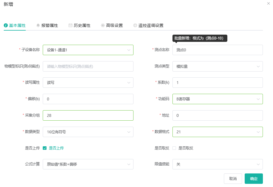 举例采集一个地址为B28:0/4、类型为二进制的寄存器,那么新建一个测点,功能码选择B寄存器,采集分组填28,寄存器地址填0,数据类型选择位,数据格式选择21。在高级设置中勾选按位取值,起始位和终止位填写4;