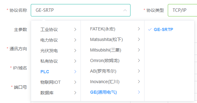 新建一个采集通道,协议选择GE-SRTP(通用电气),IP地址填写PLC的IP地址,端口号通常保持默认即可;