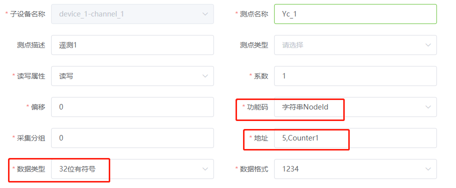 根据OPC UA服务器的“Address Space”中的数据属性建立测点,地址配置NameSpace Index,Identifier,以及数据类型和功能码要配置正确。