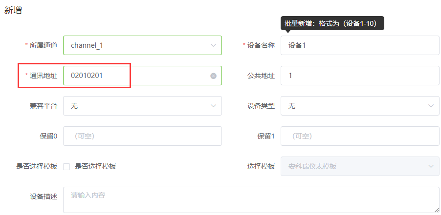 新建一个设备,自定义设备名称,设备的通讯地址填写PLC的TSAP,例如网关采集端的TSAP(源)为10.01,PLC端TSAP(目的)为10.04,那么在“通讯地址”处填写“10011004”,其余参数留空。