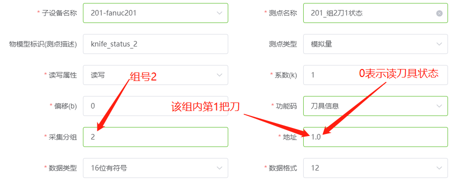 举例读取机床的刀具寿命信息,目标刀具所在组号为2,组内索引为1,那么新建一个测点,功能码选择刀具信息,采集分组填组号2,地址填1.0,1意为读取该组内的第1把刀的数据,0意为读取刀具状态,类似的,地址填1.1读取刀具编号,填1.2读取刀具使用次数,填1.3读取刀具寿命;