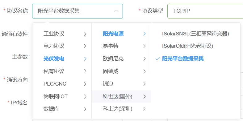 新建一个采集通道,协议选择阳光平台数据采集,在通道参数中交互频率和每帧间隔按需要配置。IP地址和端口一般不需要修改。