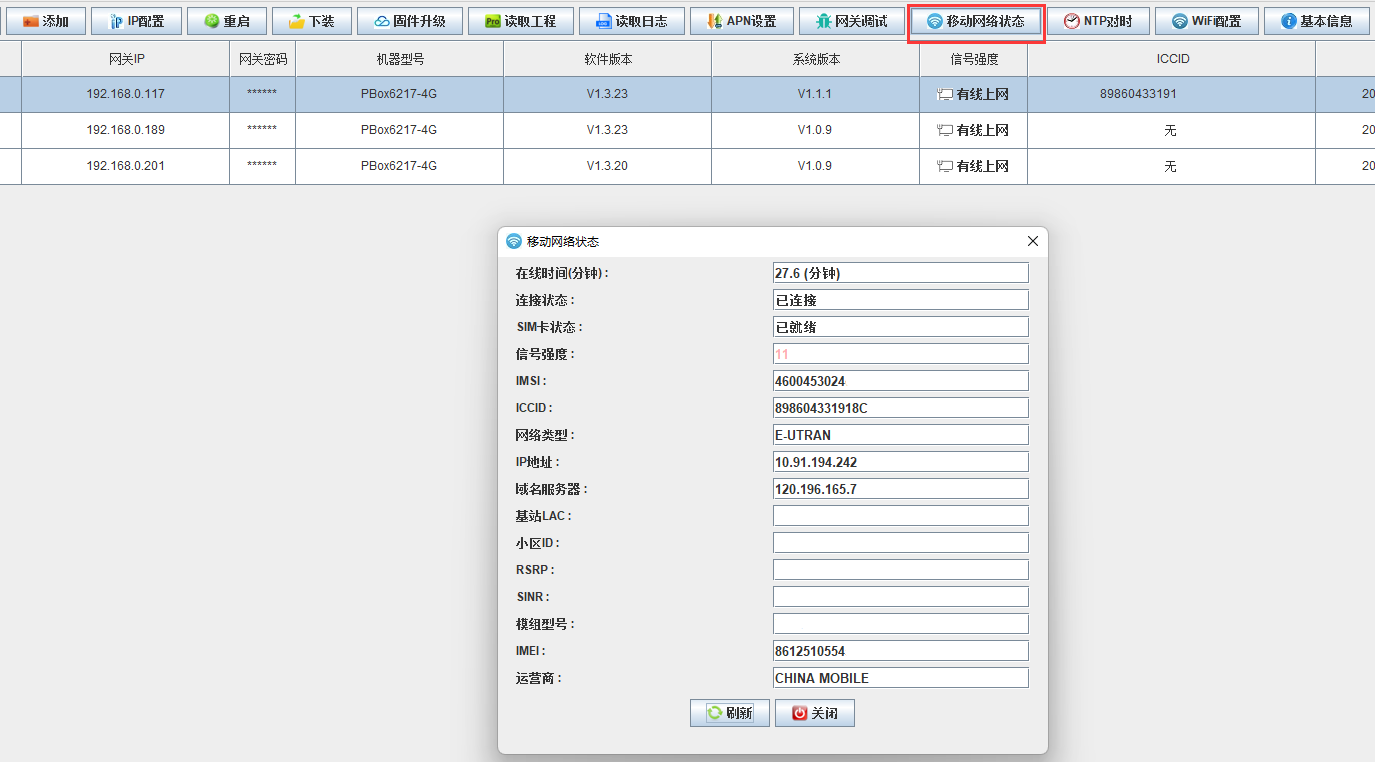 选中一行,点击移动网络状态按钮,可以查看目标网关的拨号详细信息。